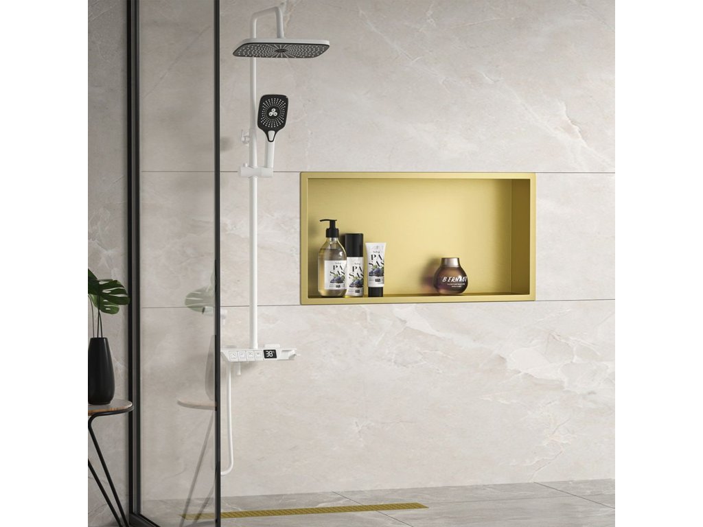 Kúpeľňová polica je praktickým riešením na usporiadanie priestoru v kúpeľni. Vyrobené z odolného materiálu zaisťuje odolnosť a stabilitu. Svojim funkčným dizajnom dokonale zapadne do rôznych kúpeľňových aranžmánov, umožní vám uložiť kozmetiku, uteráky a ďalšie potrebné doplnky. Vďaka možnosti inštalácie do výklenku polica dokonale využije dostupný priestor a zároveň dodá kúpeľni elegantný vzhľad.