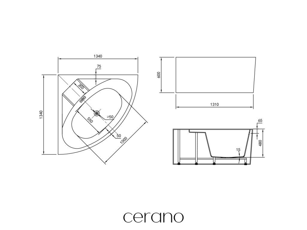 CERANO - Voľne stojaca akrylátová vaňa Cora, rohová - biela lesklá - 134x134 cm
