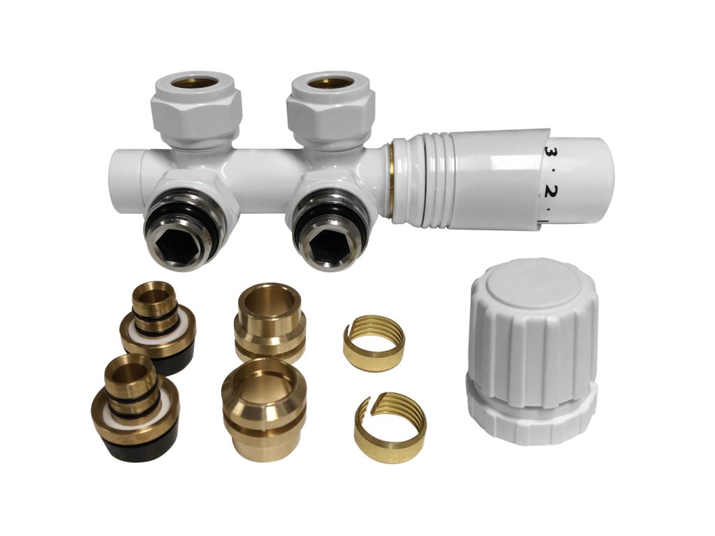 Produkt je určený na pripojenie vykurovacieho telesa z medených alebo PEX rúrok. V balení sú nasledujúce súčasti: pripojovacie adaptéry pre radiátor s priemerom 1/2" pre inštalácie s medenými rúrkami s priemerom 15 mm as PEX rúrkami s priemerom 16 mm.