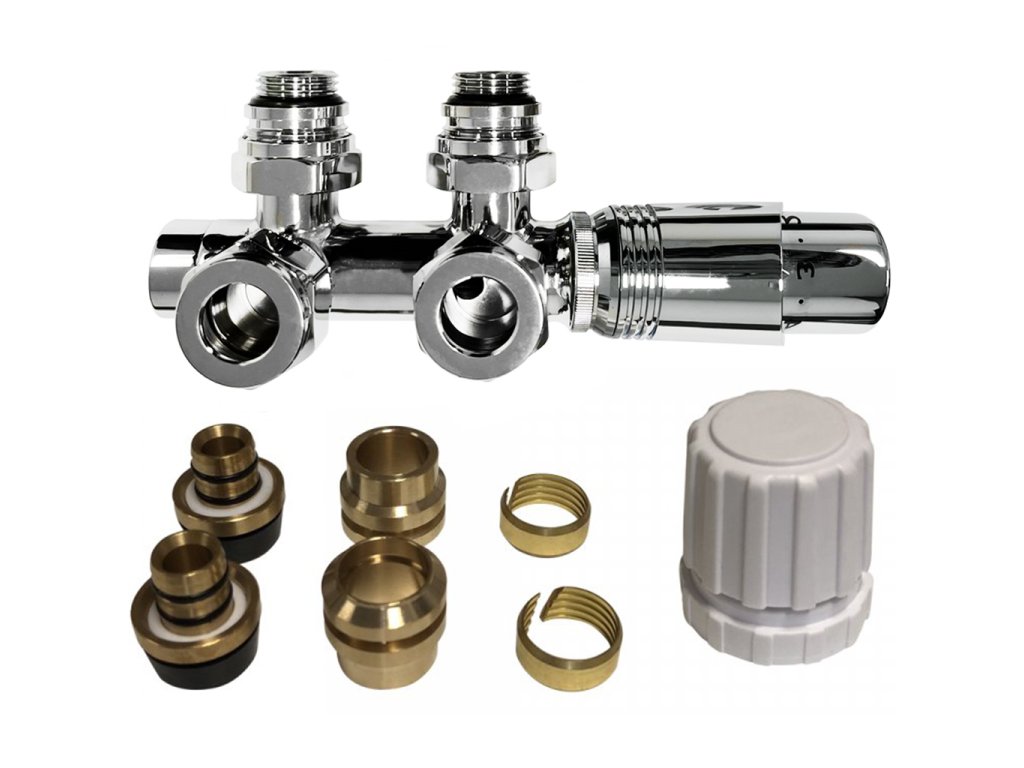Produkt je určený na pripojenie vykurovacieho telesa z medených alebo PEX rúrok. V balení sú nasledujúce súčasti: pripojovacie adaptéry pre radiátor s priemerom 1/2" pre inštalácie s medenými rúrkami s priemerom 15 mm as PEX rúrkami s priemerom 16 mm.