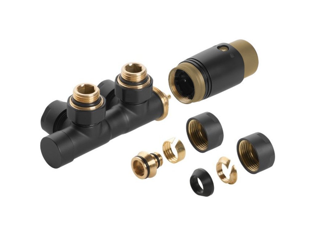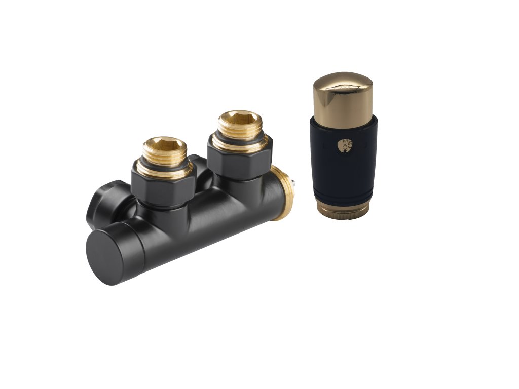 CERANO - Pripojovacia sada radiátorového ventilu s termostatickou hlavicou - stredové pripojenie 50mm - čierna matná/zlatá lesklá