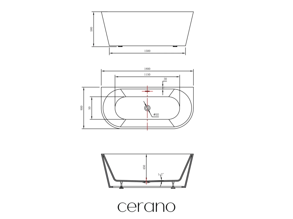 CERANO - Voľne stojaca akrylátová vaňa Bianco, nástenná - biela lesklá - 180x80 cm