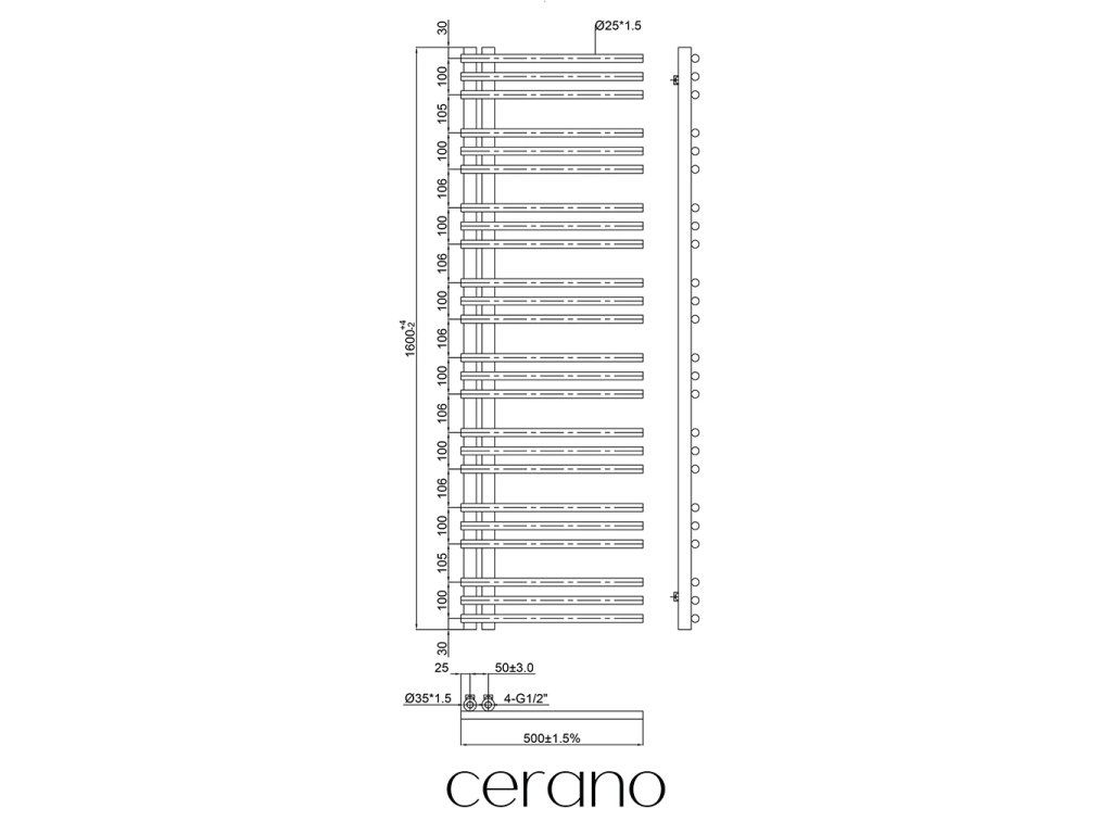 CERANO - Kúpeľňový radiátor Burke - L/P - asymetrické pripojenie 50mm - 750W - čierna matná - 1600x500 mm