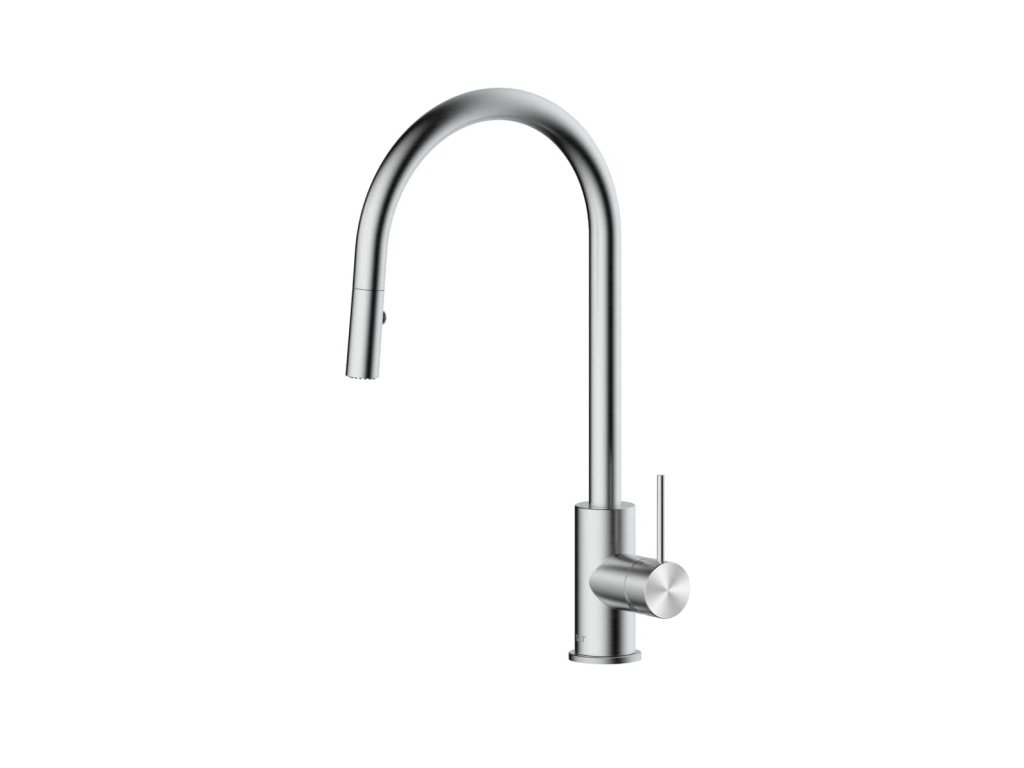 Páková stojanková drezová batéria s vyťahovacou sprškou, 2 prúdy. V okrúhlom dizajne v nerezovom prevedení. Výška batérie je 44 cm. Ramienko je vo výške 23,5 cm. S matným povrchomDodatočné parametre