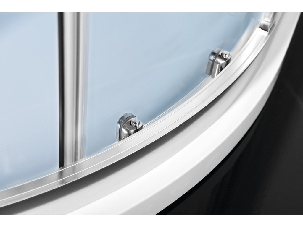 - Štvrťkruhové zásteny s dvojdielnymi posuvnými oblúkovými dverami, rohový vstup