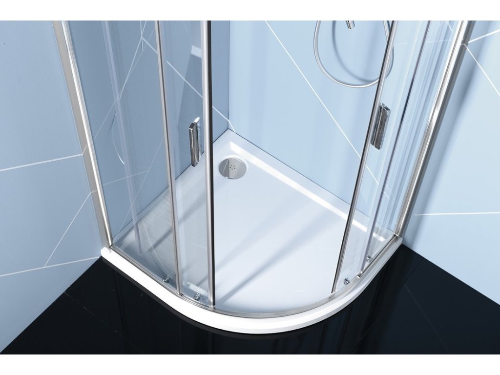 - Štvrťkruhové zásteny s dvojdielnymi posuvnými oblúkovými dverami, rohový vstup
