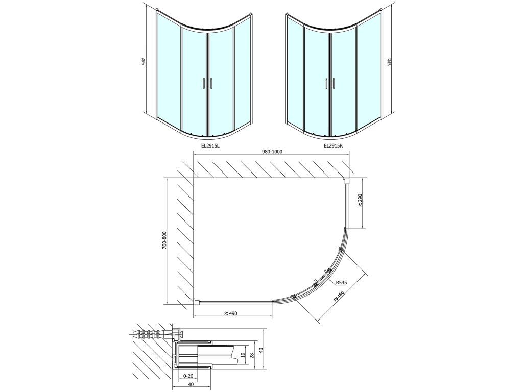 - Inštalačný rozmer dverí do niky je možné vďaka rozširovaciemu profilu EL825 zväčšiť o 25 mm na každú stranu, celkom o 50 mm
