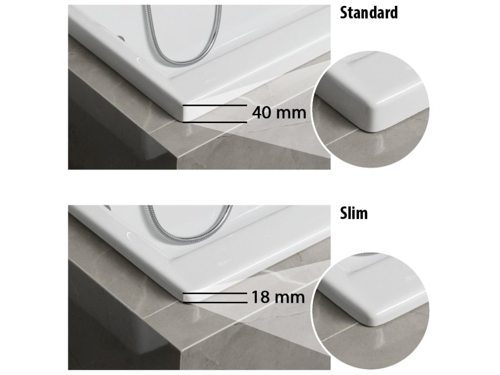 Vaňa má oproti štandardným vaniam výšku hrany okraja iba 18 mm. Pri obmurovanie tak pôsobí estetickejšie. Nemožno ju inštalovať s obkladovým panelom.