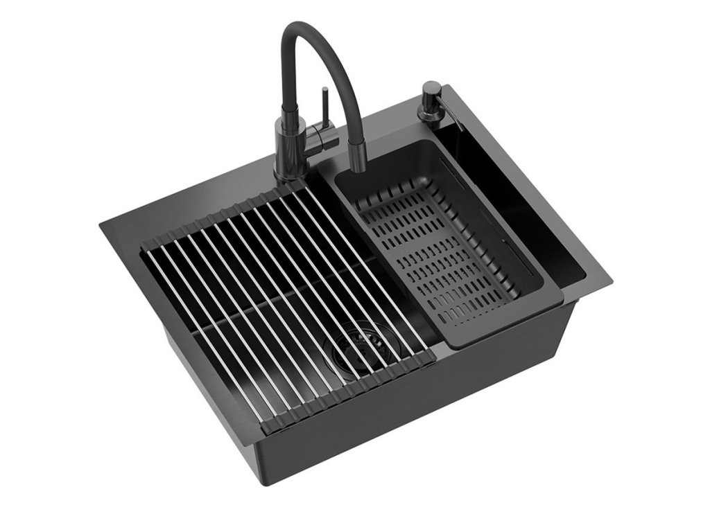 Kompletný s umývadlom: | tesnenie, sifón so sitkom, upevňovacie háčiky, Kuchynská batéria, dávkovač pracieho prostriedku, steel-silicon mat, bamboo board |