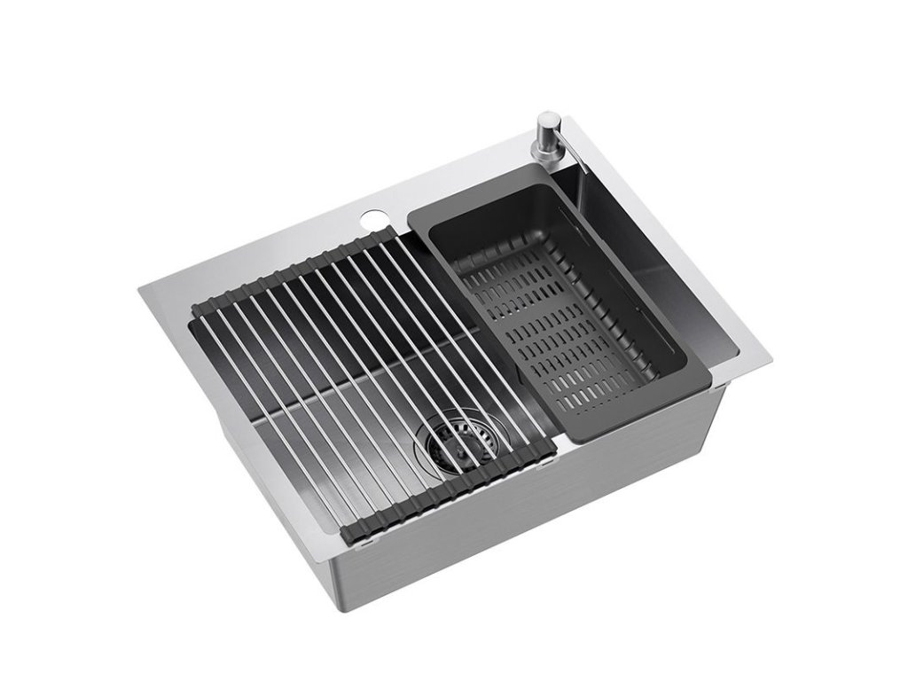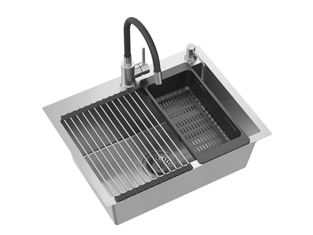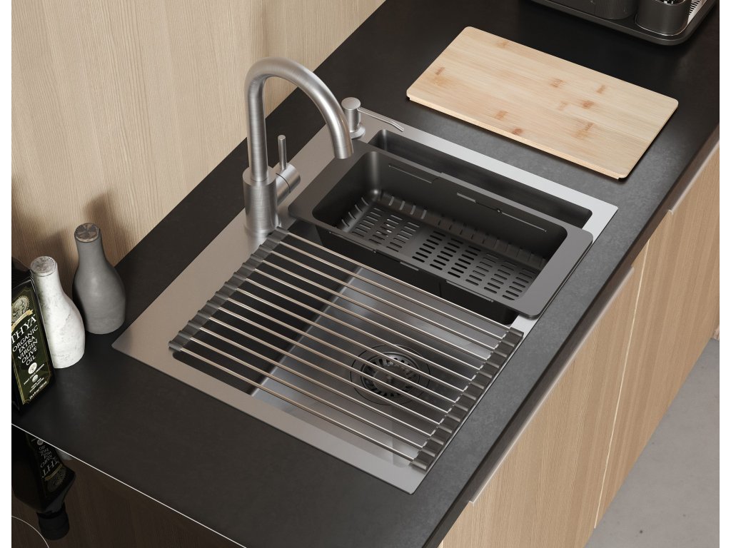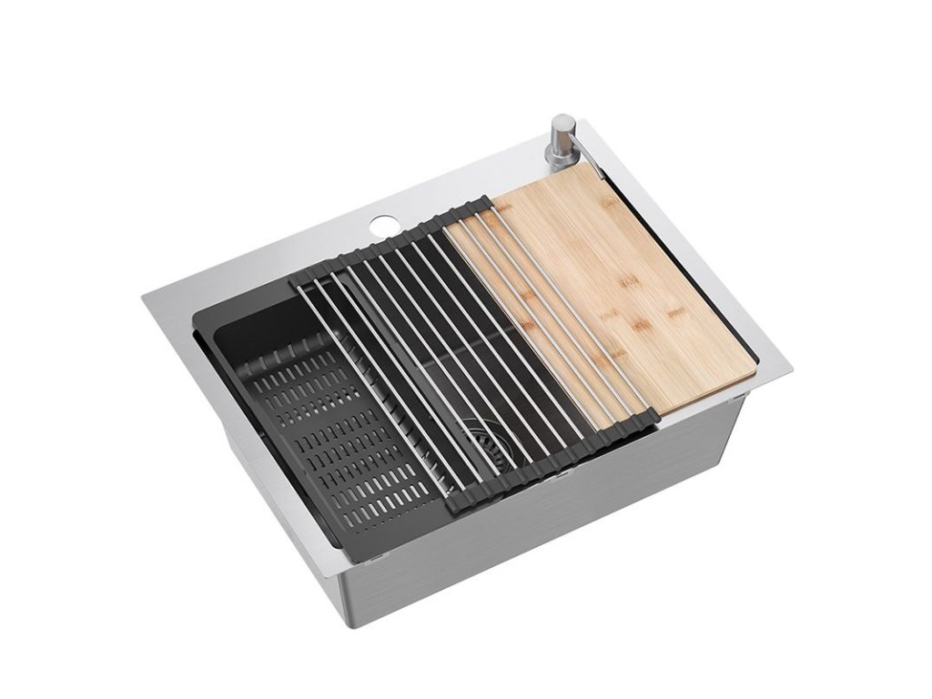 Kompletný s umývadlom: | tesnenie, sifón so sitkom, upevňovacie háčiky, Kuchynská batéria, dávkovač pracieho prostriedku, steel-silicon mat, bamboo board |