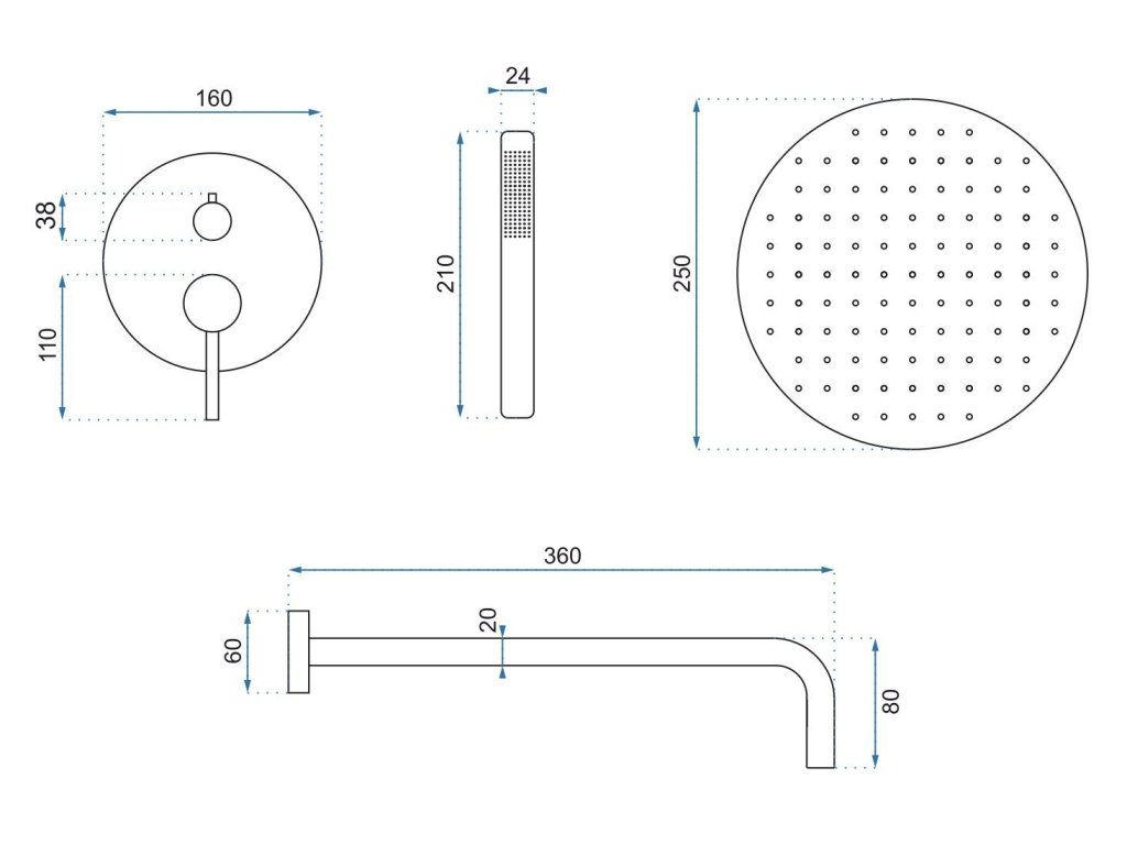| Zahrnuté: | skrytá batéria, sprchový dážď, dažďové sprchové rameno, hadica 1500 mm, slúchadlo, držiak ručnej sprchy, mriežky, box |