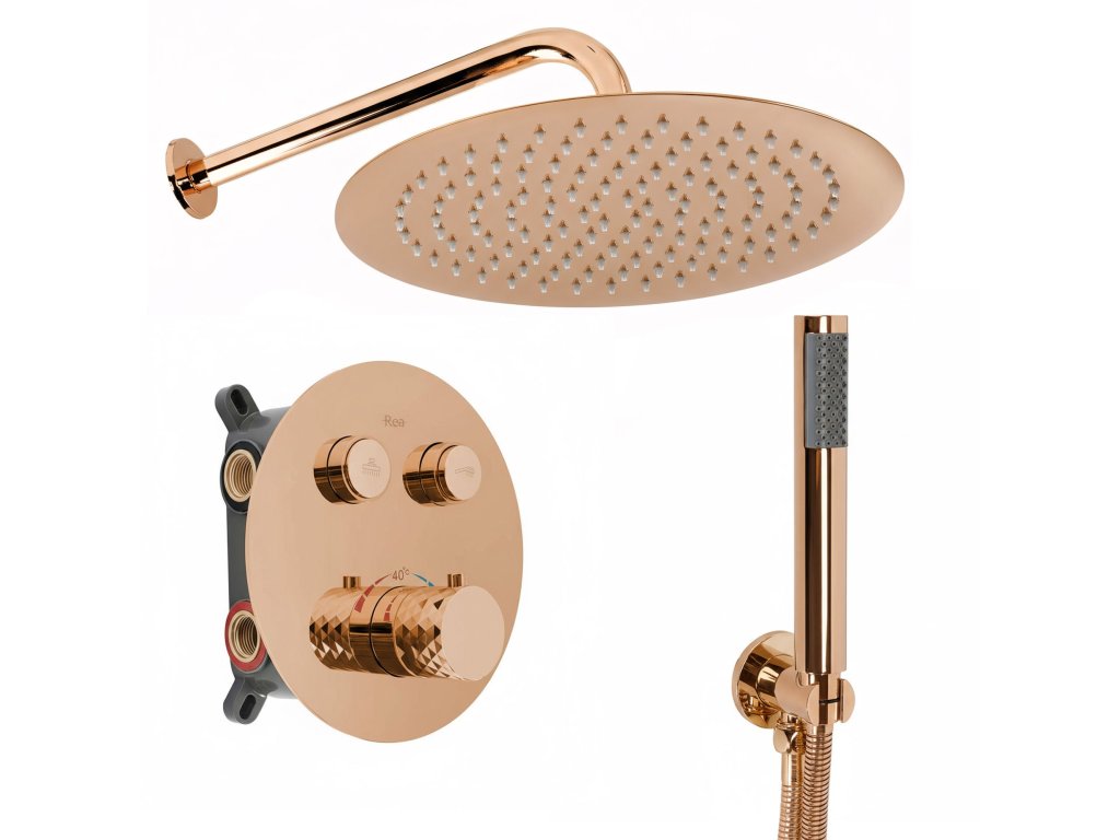 Doprajte si luxus a presnú reguláciu teploty s podomietkovým sprchovým setom Rea Lungo Diamond s termostatickou batériou vo farbe Lesklá meď. Set spája jedinečný diamantový dizajn s modernou technológiou. Je vyrobený z odolných materiálov vrátane kovovej hlavovej sprchy a tela s trvácnou PVD povrchovou úpravou, ktorá zaručuje spoľahlivosť a výnimočný vzhľad.Termostatická batéria – zaručuje konštantnú teplotu vody (s poistkou 40 °C).Farba Lesklá meď (PVD) – PVD povrch je vysoko odolný voči poškriabaniu a strate lesku.Podomietkový BOX systém – zjednodušuje montáž a umožňuje servisný prístup.Diamantové ryhovanie – výrazný dizajnový prvok pre prémiový vzhľad.Kovová hlavová sprcha – okrúhla, robustná pre relaxačný prúd vody.Anti-Calc systém – trysky obmedzujú usadzovanie vodného kameňa.Kompletný set – obsahuje batériu s BOXom, hlavovú sprchu, rameno, ručnú sprchu, hadicu a držiak.Sprchový set Rea Lungo Diamond je ideálnou voľbou pre tých, ktorí oceňujú luxus, bezpečnosť a komfort. Termostat, PVD povrch a BOX systém tvoria kompletné riešenie do modernej kúpeľne.