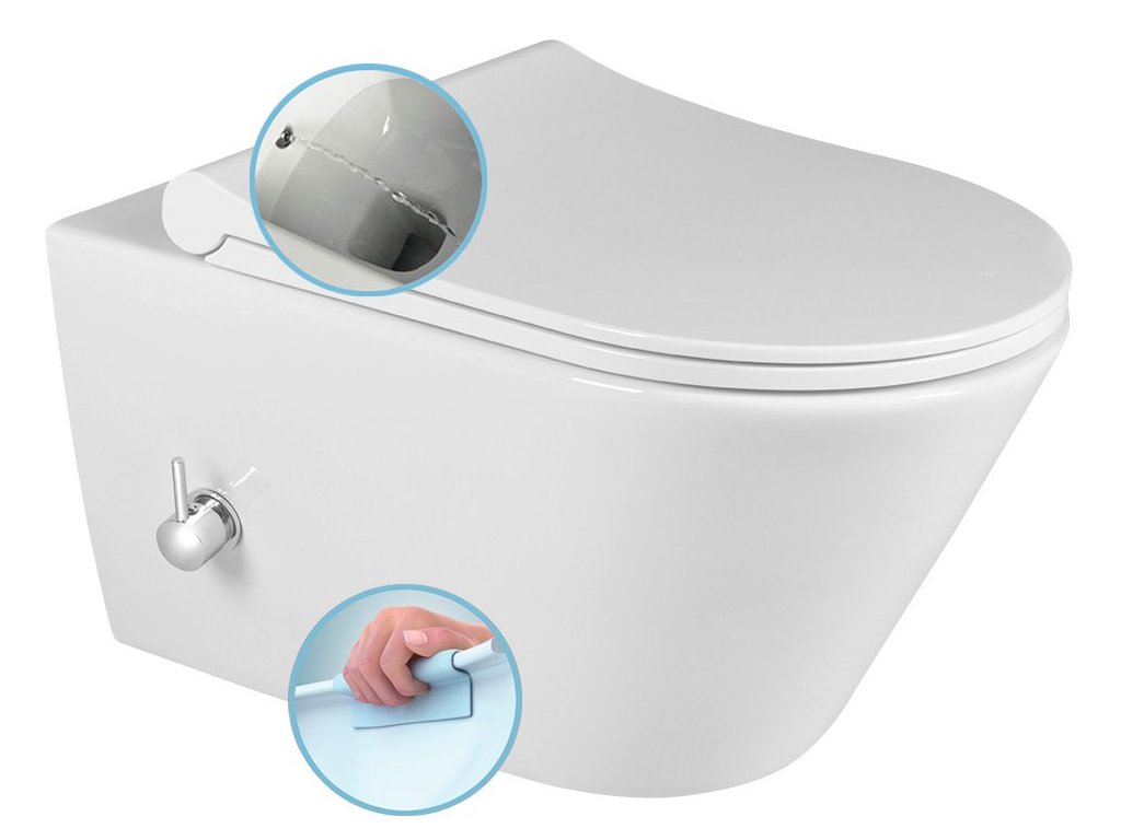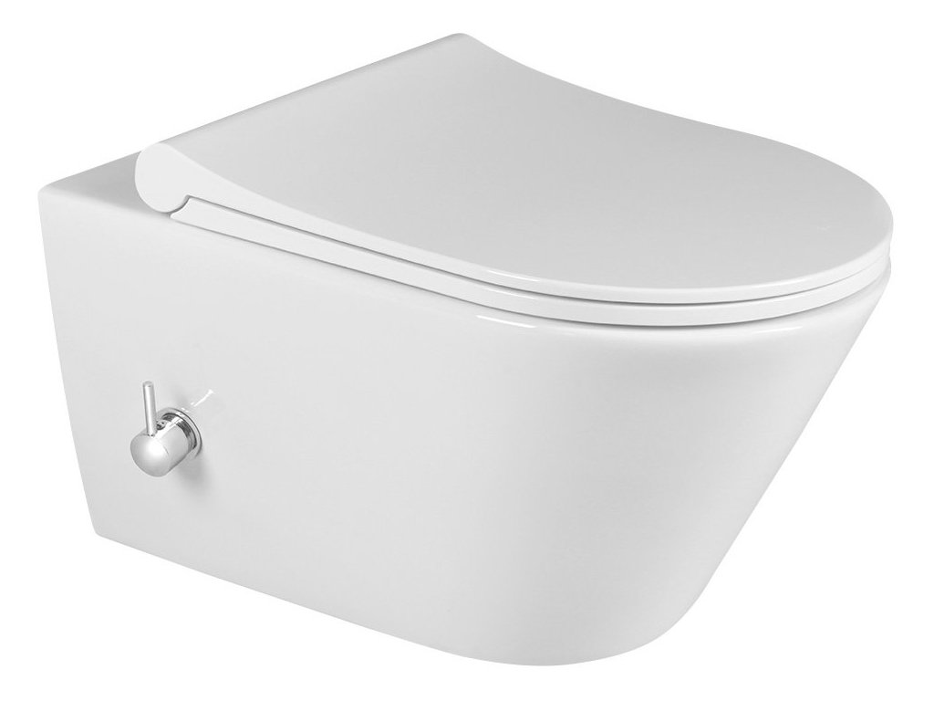 SAPHO AVVA závesná WC misa Rimless, integrovaná batéria a bidetová spŕška 35,5x53 cm, biela