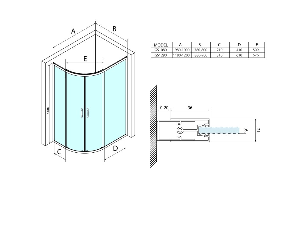 - Štvrťkruhové zásteny a štvrťkruhové zásteny s predĺženou stenou s posuvnými dverami