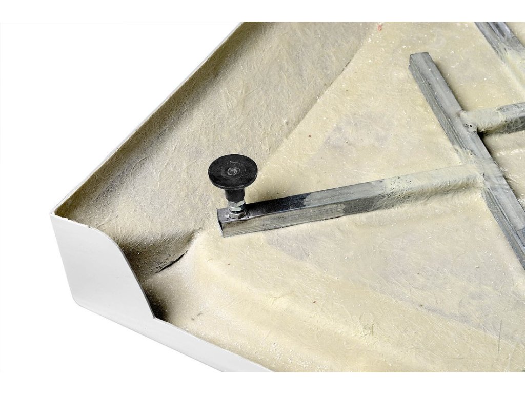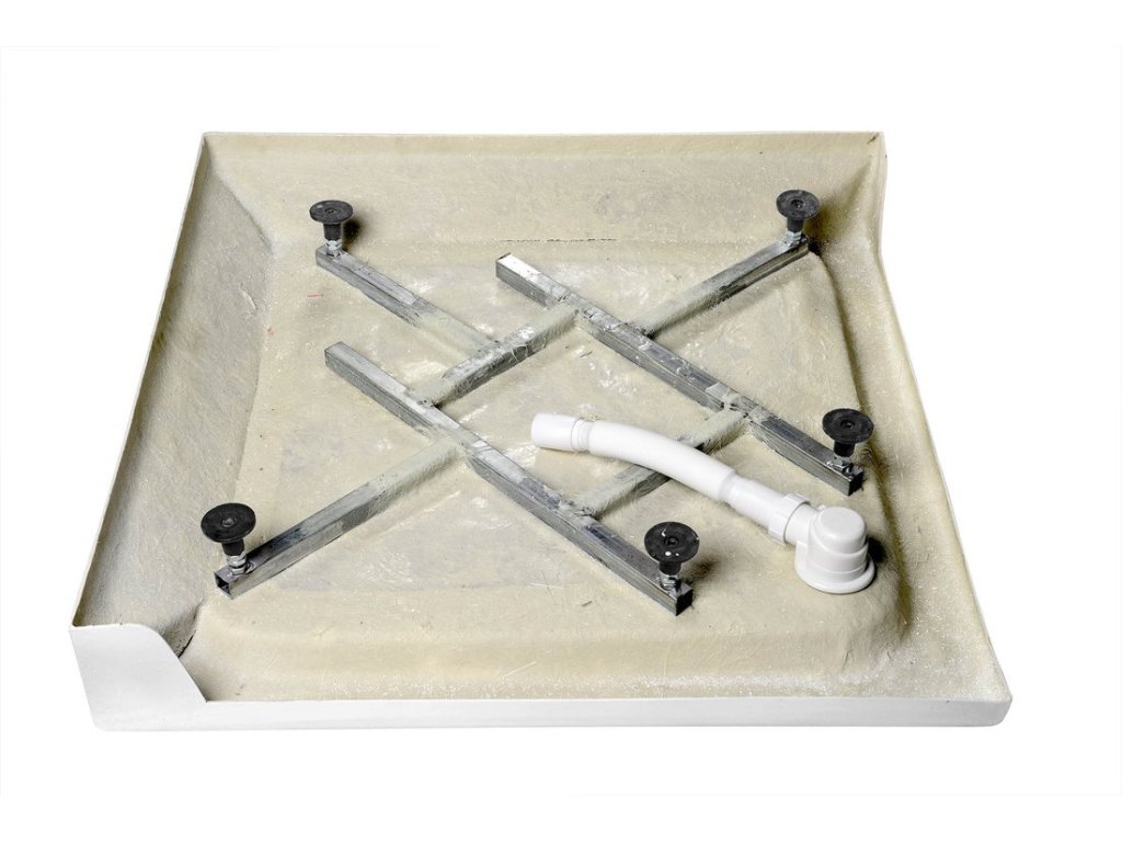 Štvorcová samonosná vanička so sifónom priemerom 60 mm, robustná kovová podperná konštrukcia pre lepšiu stabilitu.