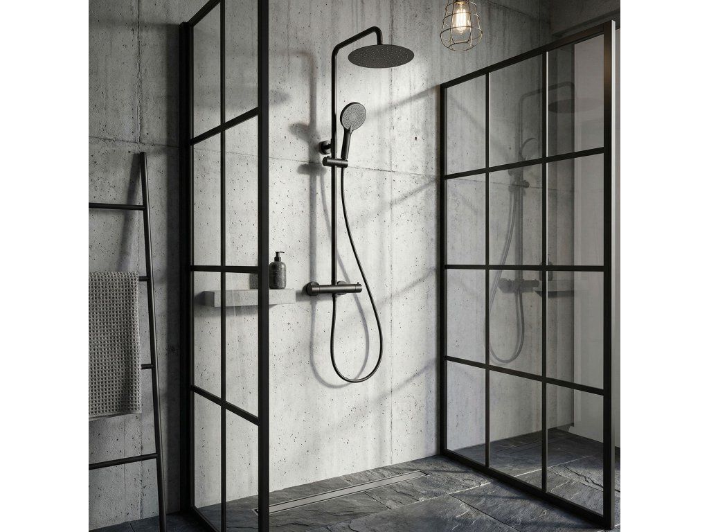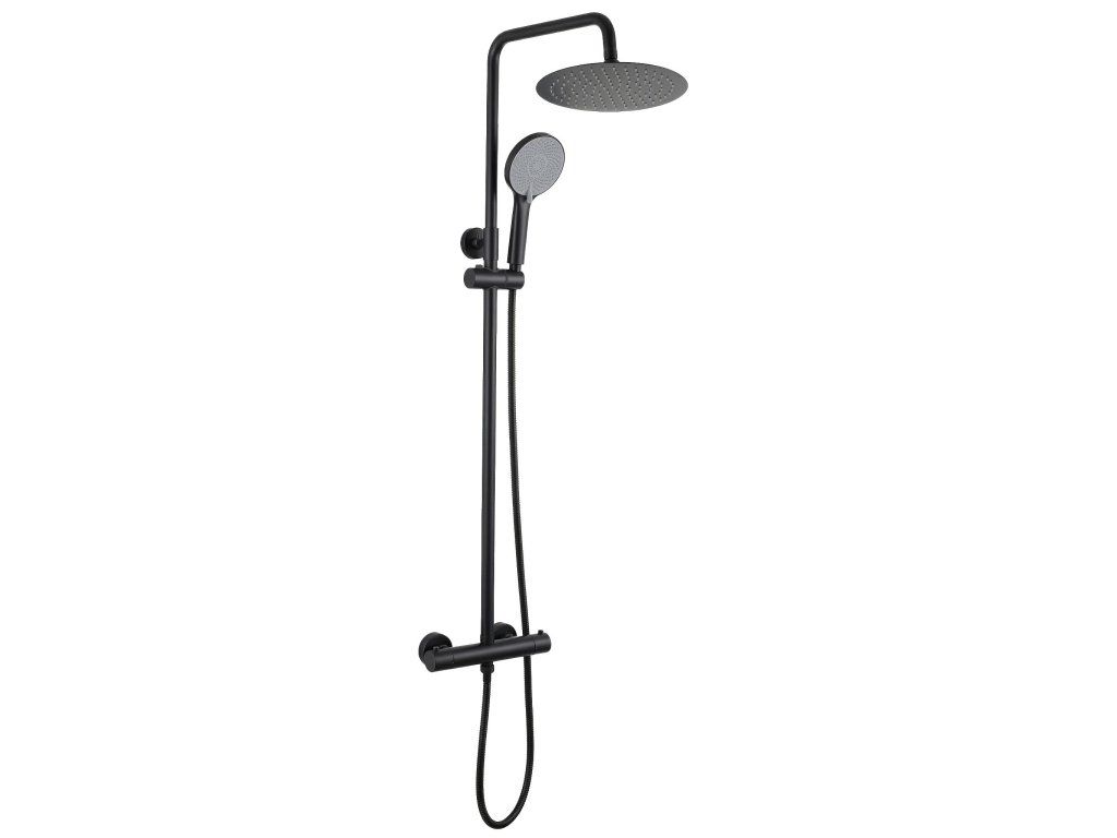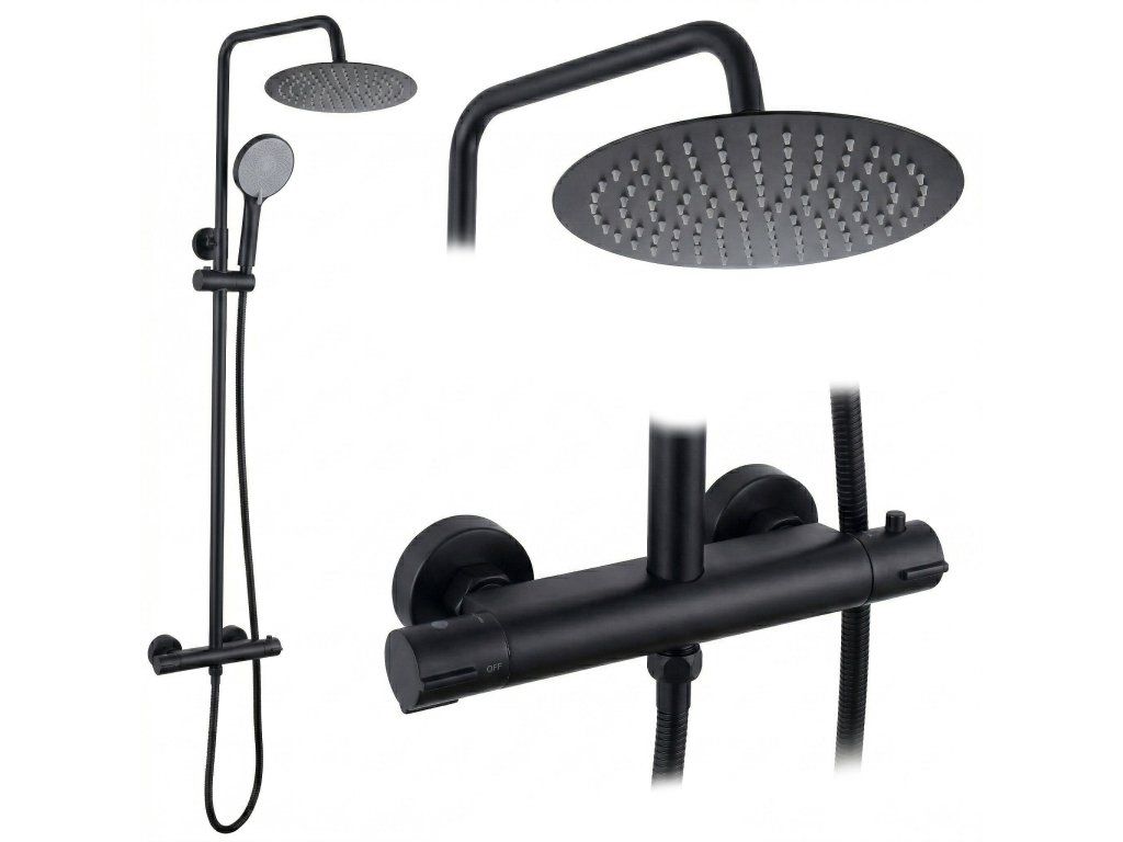 Sprchová súprava Lungo s termostatom v povrchovej úprave Čierna matná (Black Matt) je výrazným návrhom pre milovníkov moderného industriálneho štýlu a rozhodných kontrastov. Hladká, minimalistická forma série Lungo v kombinácii s hlbokou čiernou vytvára súpravu, ktorá dodáva kúpeľni surovú eleganciu a dizajnový šmrnc. Vďaka použitiu pokročilej technológie práškového lakovania sa armatúra vyznačuje vysokou životnosťou a odolnosťou.Termostatická batéria – zaručuje konštantnú teplotu vody bez ohľadu na zmeny tlaku v inštalácii, čo zaisťuje bezpečné kúpanie bez rizika obarenia.Povrchová úprava Čierna matná – zamatová na dotyk, matná plocha, ktorá tvorí dokonalý kontrast k svetlej keramike a obkladom.Vysoká odolnosť povrchu – špeciálna technológia nanášania farby chráni súpravu pred koróziou a uľahčuje udržiavanie čistoty pri správnej starostlivosti.Minimalistický dizajn Lungo – valcové, štíhle línie bez zbytočných detailov zdôrazňujú geometrickú čistotu formy.Kompletný kúpeľový systém – súprava obsahuje veľkú okrúhlu dažďovú sprchu a ergonomickú sprchovú hlavicu s nastavením výšky na tyči.Konštrukcia bez výtoku – určená do sprchových kútov, súprava zaberá minimum miesta a zaisťuje slobodu pohybu.Solidné materiály – telo z hrubej mosadze a keramická termostatická hlava zaručujú dlhoročnú bezporuchovosť.