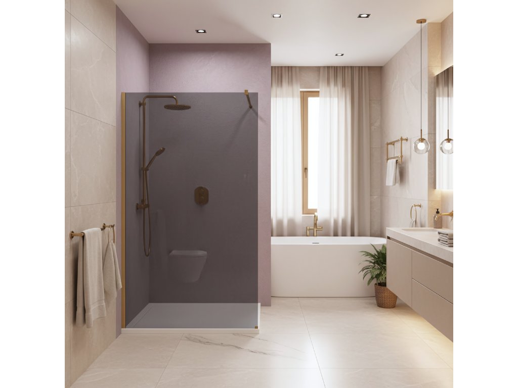 Vytvorte si vo svojej kúpeľni relaxačnú zónu s jedinečným a elegantným charakterom. Vyberte si sprchovú stenu walk-in Rea Flexi v efektnom vyhotovení: sklo v sivom odtieni a profily vo farbe Kartáčované zlato. Toto spojenie modernej, stmavenej tabule a teplého povrchu profilov dodáva interiéru triedu. Konštrukcia z bezpečného 8 mm tvrdeného skla zaručuje trvácnosť a bezpečnosť.Tvrdené sklo 8 mm (Sivé) – pevná tabuľa s elegantným sivým zafarbením, ktorá vytvára modernú atmosféru, poskytuje diskrétnosť a pekne kontrastuje so zlatom.Hliníkový profil Kartáčované zlato – štýlové vyhotovenie nástenného profilu, ktoré tvorí výrazný dekoratívny akcent.Easy Clean povlak – neviditeľná hydrofóbna vrstva uľahčujúca odtekanie vody a chrániaca sklo pred usadzovaním vodného kameňa.Vzpiera 120 cm s možnosťou skrátenia – horné stabilizačné rameno v zlatej farbe je možné skrátiť, aby sa hĺbka kabíny prispôsobila rozmerom kúpeľne.Univerzálna montáž – stenu možno nainštalovať na pravú aj ľavú stranu, na sprchovú vaničku alebo priamo na podlahu s líniovým odtokom.Walk-In konštrukcia – minimalistický, otvorený vstup bez dverí, ktorý zaručuje pohodlné používanie a moderný vzhľad.Sprchová stena Rea Flexi je určená pre tých, ktorí hľadajú neobyčajné a vkusné kombinácie. Kartáčované zlaté prvky v spojení so sivou sklenenou tabuľou vytvárajú mimoriadne efektnú kompozíciu. Vďaka povlaku Easy Clean a kvalitným materiálom výrobok spája estetiku, funkčnosť a jednoduchú údržbu.Dodatočné parametre