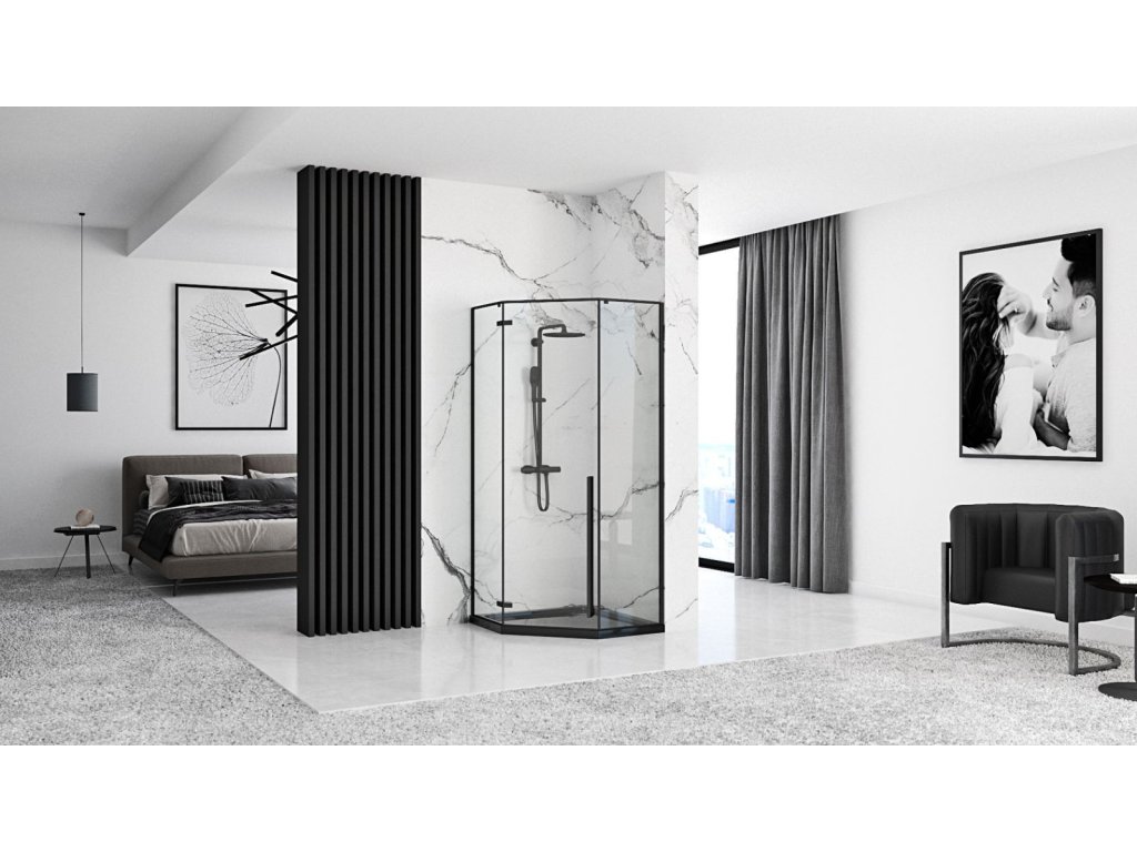 Nádherná kabína Diamond s nádychom geometrie určite osvieži každý kúpeľňový dekor a navodí úžasnú atmosféru bez ohľadu na to, či sa usporiadanie interiéru nesie v znamení moderného, vznešeného alebo akéhokoľvek iného štýlu. Čierne profily v kombinácii s priehľadným sklom nie sú ničím iným ako dokonalou vyváženosťou v dizajne celého produktu. Ďalšou hodnotou, ktorá poteší oko aj toho najnáročnejšieho vkusu, sú čierne čiary tiahnuce sa pozdĺž steny a vytvárajúce dobre vyvážený vzor. Nastaviteľné, hliníkové rameno dotvára celú kompozíciu svojim minimalizmom Easy Clean Povrchová úprava Nano Easy Clean, ktorú sme tabule pokryli vo fáze výroby, spôsobuje kondenzáciu vody na povrchu skla a jeho odvod spolu so všetkými nečistotami. Vďaka tomu ľahko udržíte svoju kúpeľňu bezchybne čistú.