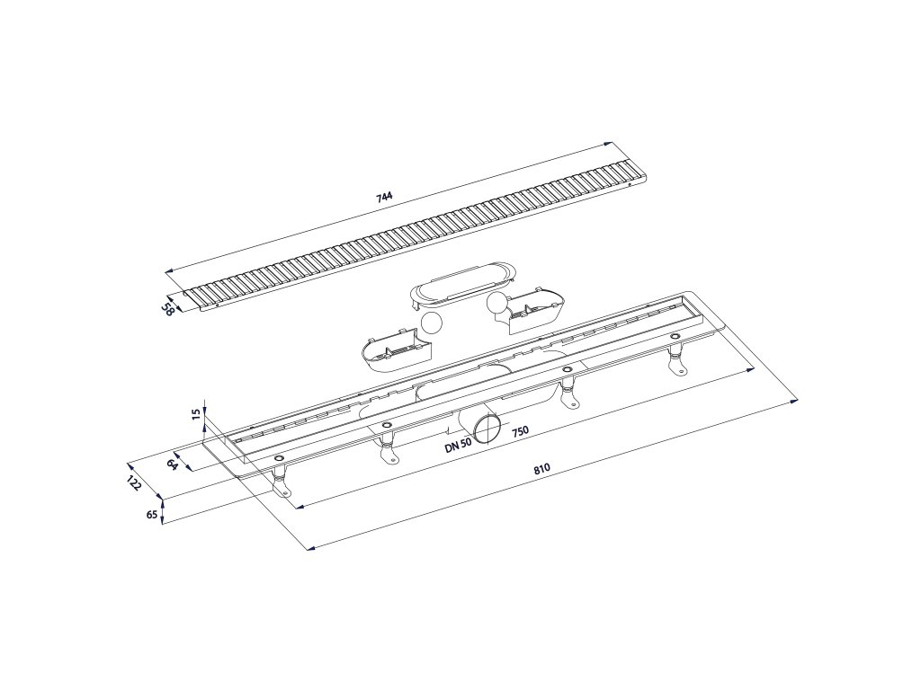Sprchový kanálik s nerezovým roštom, DN50, 810x122x65 mm