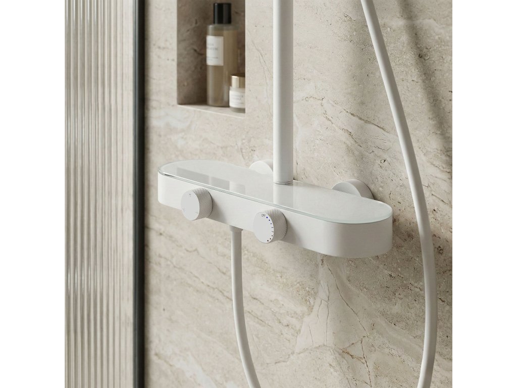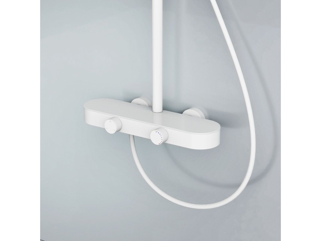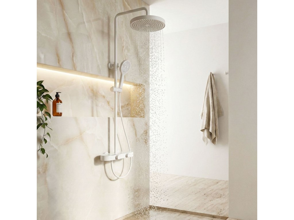 Sprchový set REA Creo Biely je moderné nástenné riešenie, ktoré spája elegantný saténový odtieň s komfortom každodenného používania. Model bol navrhnutý s dôrazom na funkčnosť a estetiku, vďaka čomu sa hodí do moderných, loftových aj industriálnych kúpeľní. Plynulá regulácia otočnými ovládačmi – batéria je vybavená dvoma ergonomickými ovládačmi. Prvý umožňuje presné a pohodlné nastavenie teploty vody a druhý slúži na prepínanie režimov prúdu medzi hlavovou sprchou, ručnou sprchou a výtokom. Ručná sprcha s funkciou Bidetty – praktická ručná sprcha má tlačidlo na zadnej strane a dodatočný výstup na vrchu. Po aktivácii môže slúžiť ako hygienická sprška, čo uľahčuje rýchle opláchnutie sprchového kúta, umytie vaničky alebo naplnenie vysokého vedra. Diskrétny kaskádový výtok – integrovaný výtok zabezpečuje široký kaskádový prúd, ktorý sa hodí pri umývaní rúk alebo napúšťaní nádoby bez potreby používať ručnú sprchu. Technológia Electroplating – matná biela povrchová úprava bola získaná metódou galvanizácie. Povrch je hladký, odolný a rezistentný voči vlhkosti aj každodennému používaniu. Pevná konštrukcia – telo batérie je vyrobené z odolnej mosadze, čo sa premieta do stability a dlhej životnosti. Hlavová sprcha a ručná sprcha z ABS sú ľahké, praktické a ľahko sa udržiavajú v čistote. Sklenené vyhotovenie batérie – horná plocha batérie je chránená sklenenou doskou, ktorá je dekoratívnym aj praktickým prvkom, vďaka čomu môže batéria slúžiť ako dodatočná polička na kozmetiku počas sprchovania. Komfortné prispôsobenie – tyč s nastaviteľnou výškou umožňuje prispôsobiť polohu hlavovej sprchy výške používateľov aj rozloženiu sprchovej zóny. REA Creo Biely je premyslený sprchový set pre ľudí, ktorí očakávajú moderný vzhľad a pohodlné ovládanie. Funkčné riešenia a odolné materiály robia každodenné sprchovanie komfortnejším a intuitívnejším.