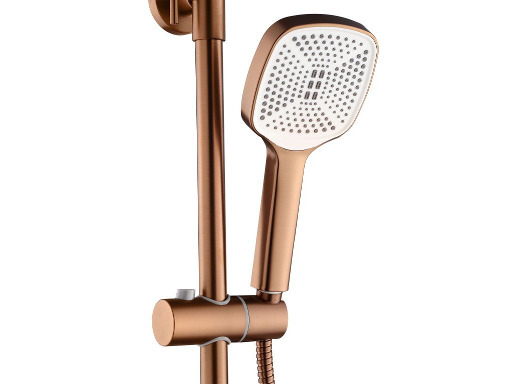 Sprchová sada navrhnutá pre najvyššie na pohodlie a funkčnosť. Vďaka špeciálnej etape výroby zaručuje maximálnu bezpečnosť a pohodlie pri každodennom používaní. Vyrobené z kvalitnej mosadze, odolného materiálu voči korózii. Jedinečný dizajn a vysoká kvalita použitých materiálov zaručujú odolnosť a spoľahlivosť mnoho rokov. Súčasťou sady je dažďová sprcha a ručná sprcha. Kartáčovaná meďDodatočné parametre