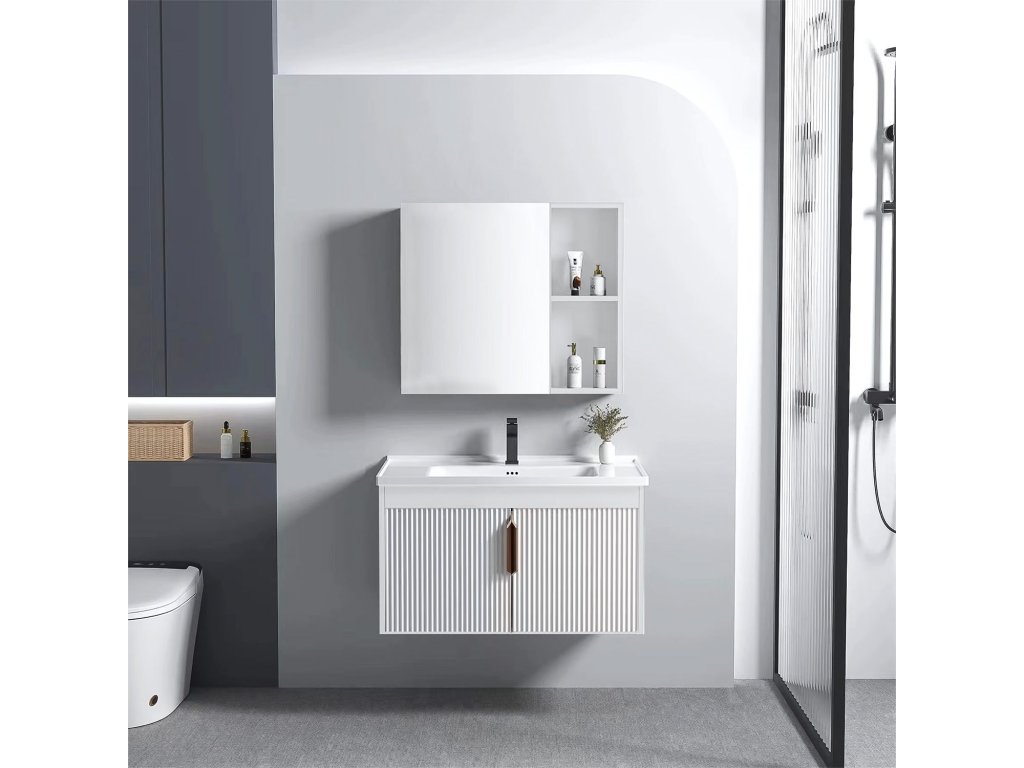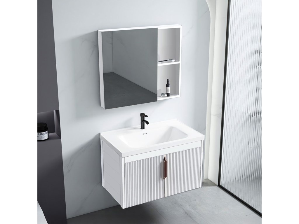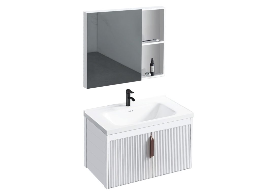 Kúpeľňová zostava – skrinka s umývadlom a zrkadlom Funkčný a moderný kúpeľňový nábytok predstavuje hotové riešenie na vytvorenie praktickej umývadlovej zóny. Súčasťou zostavy je závesná skrinka s keramickým umývadlom a skrinka so zrkadlom a bočnými poličkami, ktoré uľahčujú uskladnenie každodennej kozmetiky. Dostupné farebné varianty a elegantná úchytka umožňujú prispôsobenie rôznym štýlom kúpeľní – od minimalistických po moderné. Nástenná montáž zabezpečuje vizuálnu ľahkosť a uľahčuje udržiavanie čistoty. Ide o praktickú voľbu, ktorá spája estetiku s každodenným pohodlím – bez nutnosti dokupovať jednotlivé prvky.