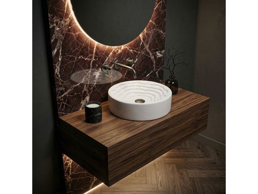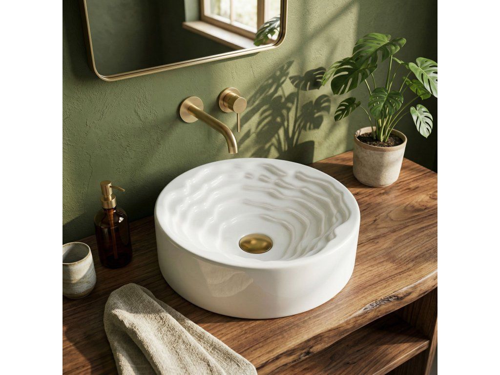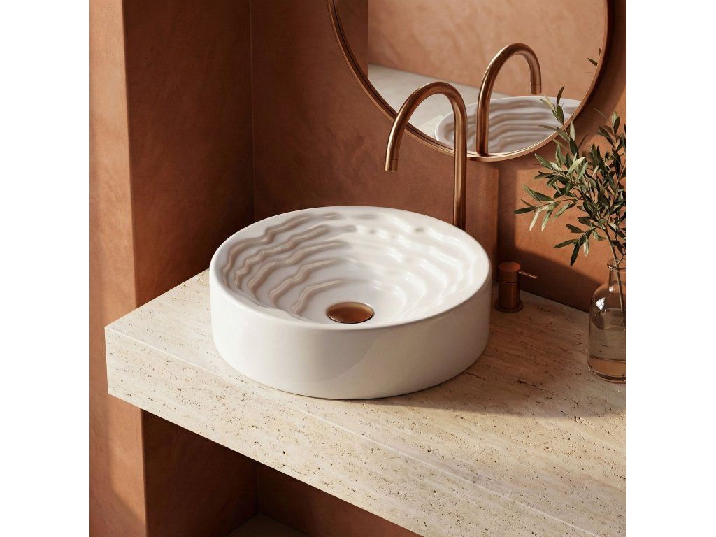 Objavte nový rozmer dizajnu vo svojej kúpeľni s okrúhlym umývadlom na dosku Rea Calla. Tento keramický model spája minimalistickú vonkajšiu formu s prekvapivým umeleckým vnútrom misy a stáva sa skutočnou ozdobou každej kúpeľne.Unikátne vnútro misy – stred umývadla zaujme trojrozmernou kaskádovitou a stupňovitou štruktúrou s nepravidelnými líniami. Tento priestorový vlnitý vzor dodáva celému telesu výrazný sochársky charakter.Hladký vonkajší povrch – v elegantnom kontraste s bohato zdobeným vnútrom si vonkajšia časť misy zachováva dokonale hladký, klasický valcový tvar, čím do formy vnáša dávku harmónie a pokoja.Lesklá sanitárna keramika – výroba z najkvalitnejšej bielej keramiky zaručuje odolnosť voči poškriabaniu a zmene farby. Lesklá, snehobiela glazúra krásne odráža svetlo, čím ešte viac zdôrazňuje trojrozmernosť vnútorného tvarovania.Pohodlie pri používaní – napriek vyrezávanej štruktúre uľahčujú vhodne profilované, jemné línie vĺn a dokonale hladká glazúra odtok vody a zaisťujú, že údržba umývadla v čistote je rýchla a bezproblémová.Montáž na dosku – umývadlo je prispôsobené na inštaláciu na dosku alebo kúpeľňovú skrinku, vďaka čomu sa stáva centrálnym, pútavým bodom umývacej zóny.Keramické umývadlo Calla je ideálnou voľbou pre ľudí, ktorí hľadajú netradičné riešenia do interiérov v modernom, avantgardnom alebo glamour štýle.