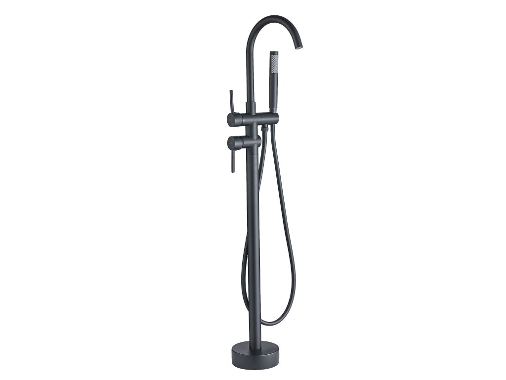 Moderná a funkčná podlahová batéria v čiernej farbe zaujme svojím neobvyklým dizajnom. Dokonale vyplní priestor kúpeľne. Výrobok je vyrobený z mosadze s trojitou vrstvou matného čierneho povlaku. Mixér je veľmi odolný a ľahko sa čistí. Voľne stojace vaňové batérie sú modernou a elegantnou možnosťou umiestnenia batérie v každej kúpeľni. Je to zaujímavá alternatíva k batériám namontovaným v stenách a na okrajoch vane. Sú ideálne do kúpeľní s väčšou plochou, kde plnia nielen čisto funkčnú, ale aj dekoratívnu úlohu. V kombinácii s krásnou vaňou, ktorá ladí s dizajnom batérie, vytvárajú dokonalý vizuálny efekt. Keramické hlavice zaručujú dlhú životnosť, slúchadlo je vybavené systémom Anti-Calc, ktorý zabraňuje usadzovaniu vodného kameňa. InštrukcieDodatočné parametre