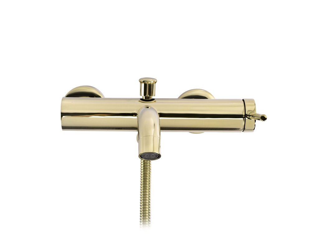 Funkčná a moderná vaňová batéria Spot v odtieni zlata je dokonalou kombináciou elegancie a praktickosti. Štýlovo dopĺňa kúpeľňu a zachováva bezchybný vzhľad i estetiku interiéru. Batéria je určená na nástennú montáž, vďaka čomu sa hodí do moderných aj klasických kúpeľní. Telo je vyrobené z vysoko kvalitnej mosadze, pokrytej trojitou vrstvou v odtieni zlata. Vďaka špeciálnej fáze výroby je batéria mimoriadne trvácna, odolná proti poškriabaniu a ľahko sa čistí, čo z nej robí spoľahlivý prvok kúpeľňového vybavenia.Dodatočné parametre
