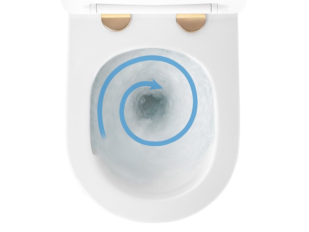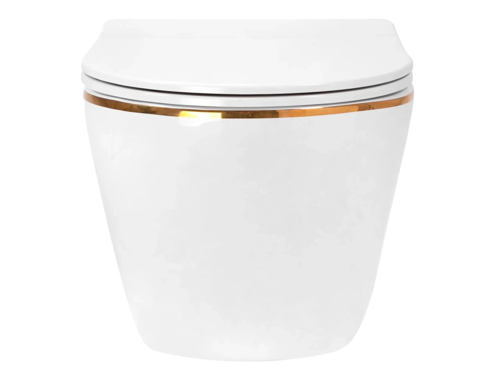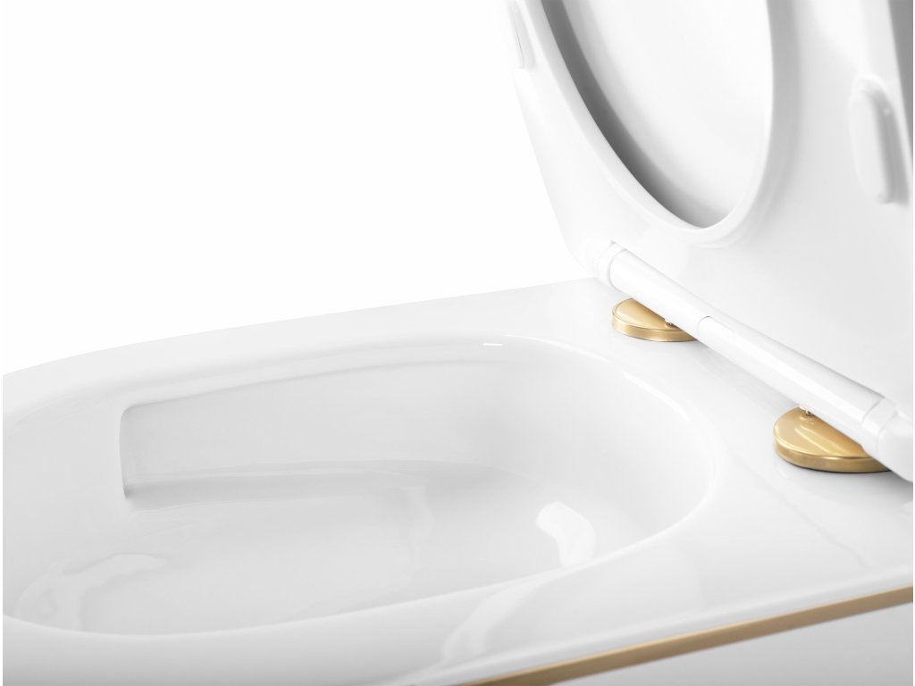Bezrámová závesná WC misa, biela so zlatým okrajom a inovatívnym splachovacím systémom Tornado je moderným riešením, ktoré spája eleganciu, jednoduché čistenie a účinnosť splachovania. Bezrámový dizajn dodáva nielen moderný nádych, ale tiež uľahčuje udržiavanie okolia misy v čistote. Tornado System: Vďaka pokročilému splachovaciemu systému Tornado voda krúživým pohybom steká dole a efektívne tak opláchne celý povrch misy. To zaisťuje nielen dôkladné opláchnutie, ale zároveň minimalizuje usadzovanie nečistôt, čo prispieva k hygiene. Miska je vhodná pre väčšinu podomietkových rámov Geberit, Grohe, Sanit, Rea.Dodatočné parametre