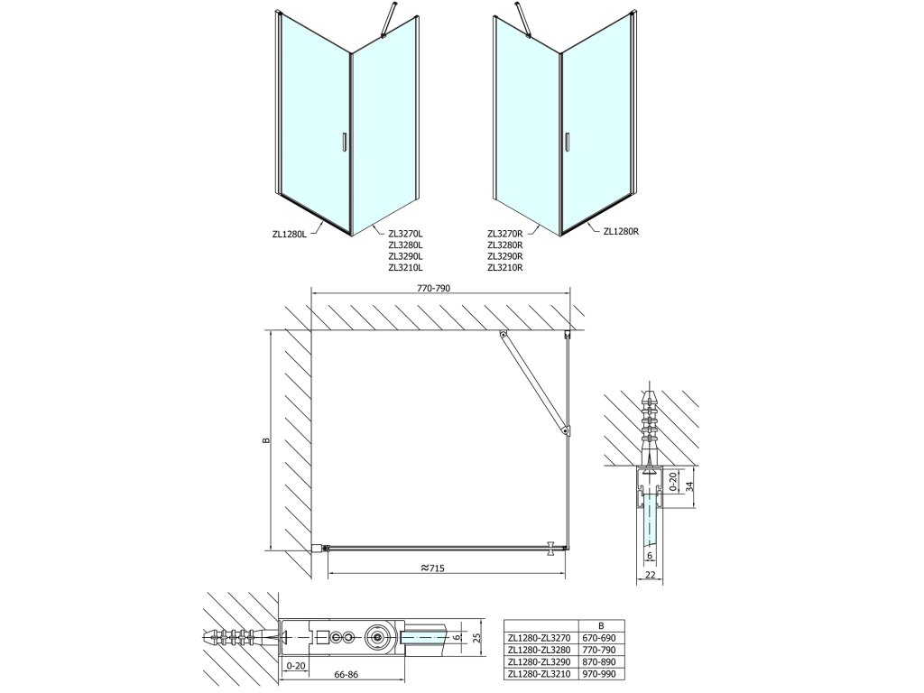 - Dvere je možné inštalovať do niky alebo v kombinácii s bočnou stenou, umožňujú variabilné inštaláciu s ľavým alebo pravým otváraním