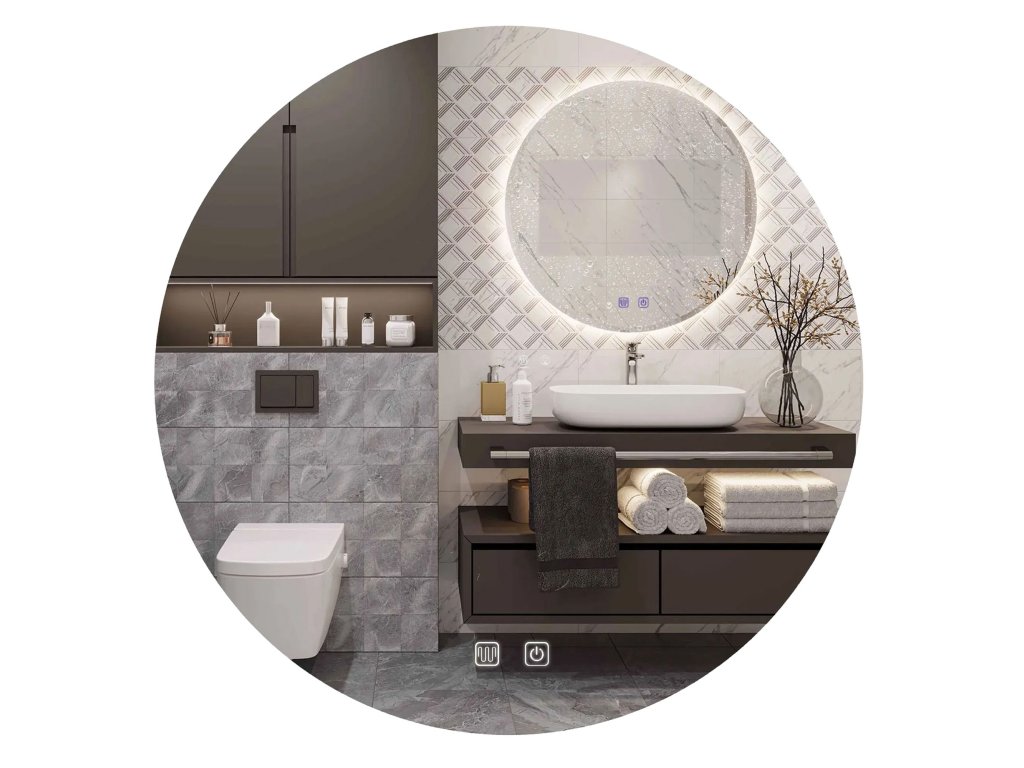 Okrągłe lustro z podświetleniem Led to idealna propozycja dla tych którzy cenią sobie wygodę użytkowania oraz nowoczesny design. Lustro jest wykonane z najwyższej jakości materiałów, idealnie się prezentuje oraz jest bardzo wytrzymałe. Posiada do wyboru trzy zmieniane dotykowo barwy światła Led – ciepła, neutralną i zimną oraz funkcję podgrzewania zapobiegającą zaparowaniu powierzchni. Przełącznik dotykowy umieszczony w tafli lustra podświetlany jest na niebiesko przy aktywności funkcji. Przewód zasilający w kolorze białym o długości 110cm.Dodatočné parametre